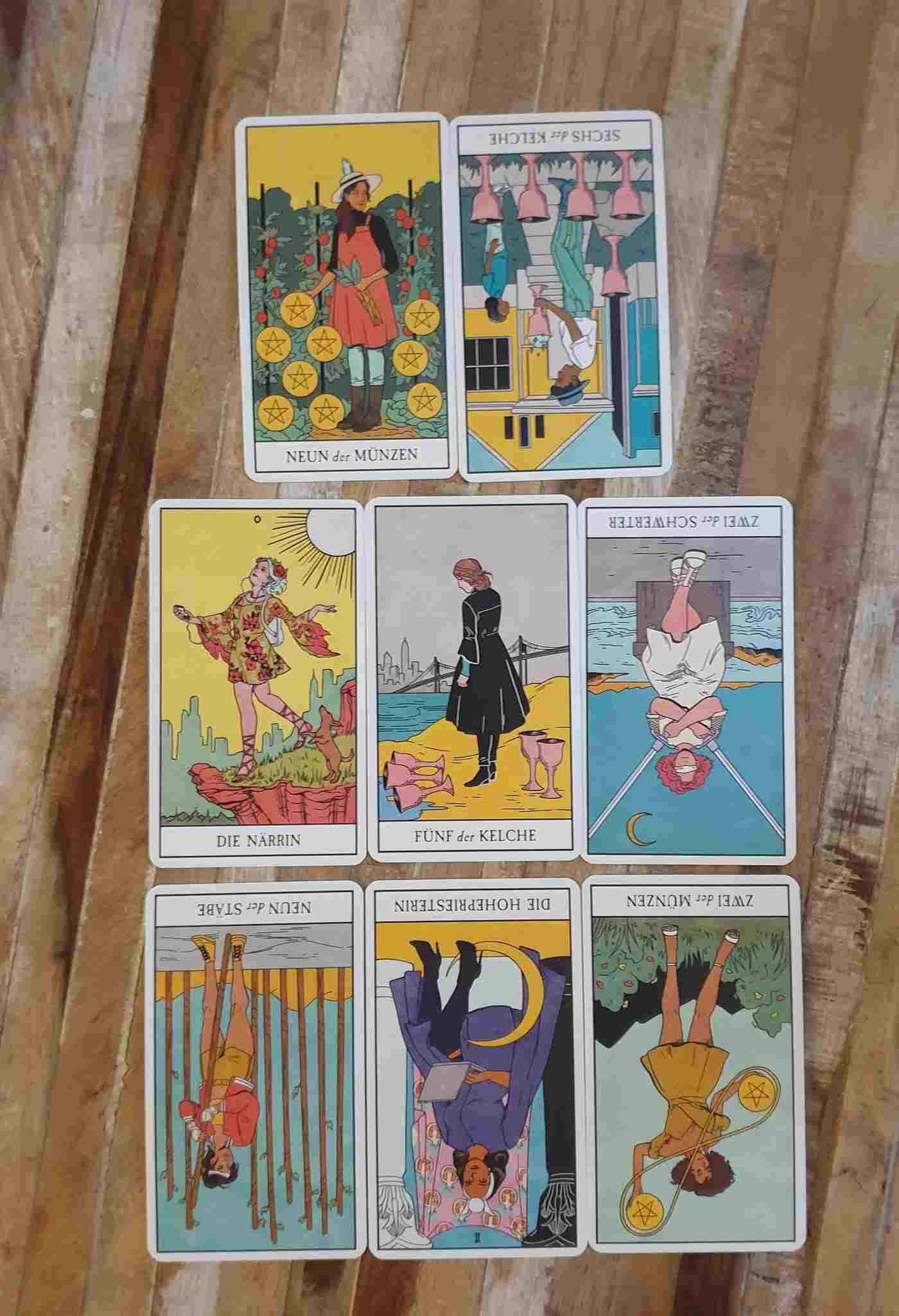 Karten: 9 der Stäbe (Schatten), Die Hohepriesterin (Schatten) & 2 der Münzen (Schatten)
