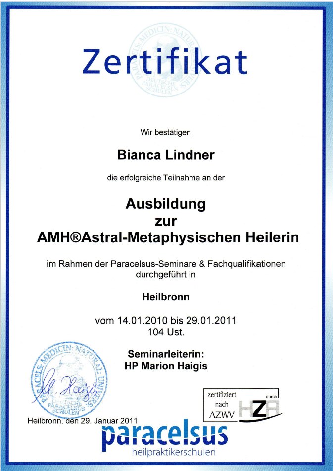 - 01 / 2010 – 01 / 2011 Erfolgreiche Heiler Ausbildung zur AMH® Astral-Metaphysischen Heilerin– Eine vom DHG ev. (Dachverband Geistiges Heilen) anerkannte Ausbildung – Unter Leitung von Marion Haigis an der Paracelsus Schule in Heilbronn.