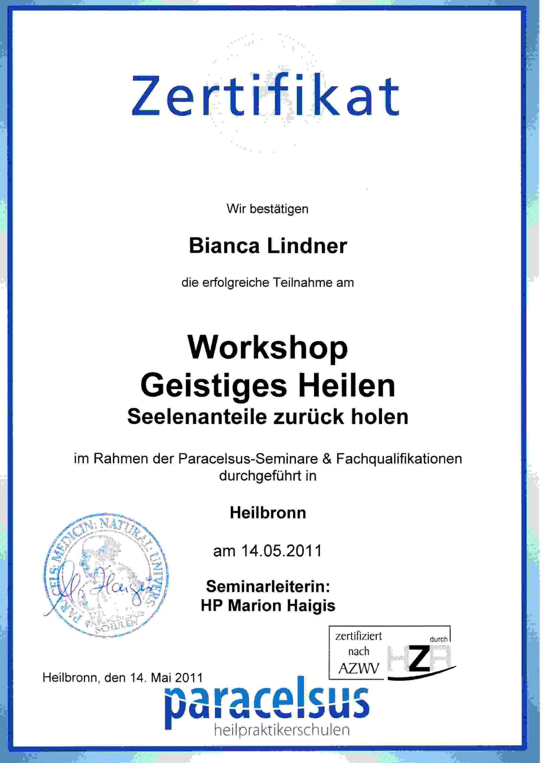 - 05 / 2011 Workshop – Geistiges Heilen – Seelenanteile Rückholung – Unter Leitung von Marion Haigis an der Paracelsus Schule in Heilbronn.