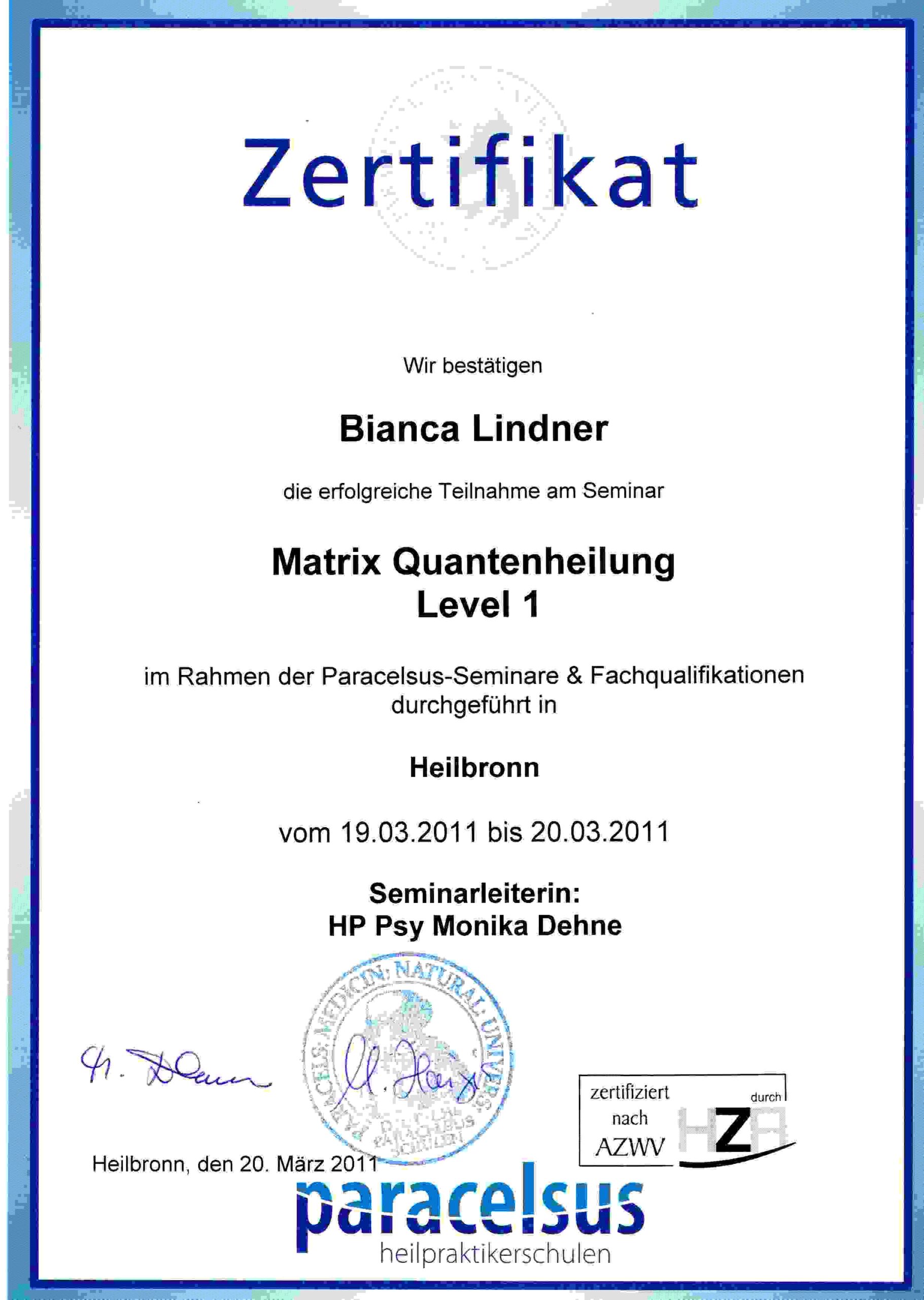- 03 / 2011 Seminar Matrix Quantenheilung – Level 1- Unter Leitung von HP PSY Marion Dehne an der Paracelsus Schule in Heilbronn.