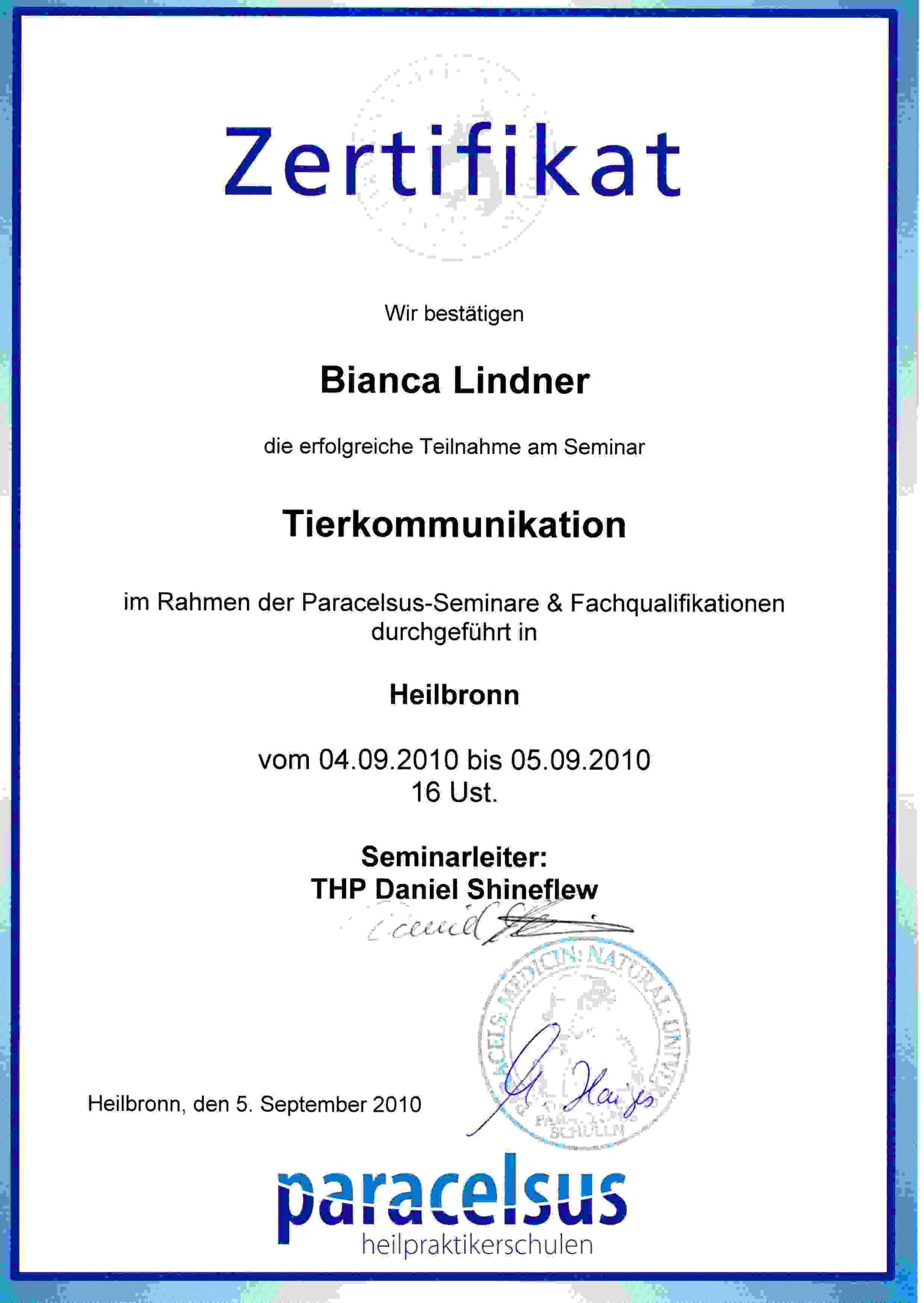 - 09 / 2010 Seminar Tierkommunikation – Unter Leitung von Daniel Shineflew an der Paracelsus Schule in Heilbronn.